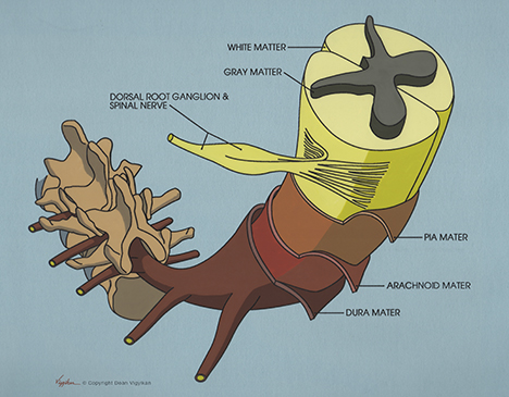 As noted elsewhere, I sometimes like to employ a sense of exaggerated perspective to add interest and drama to certain illustrations and paintings. This depiction of normal spinal cord anatomy was enjoyable to create because it makes use of such an exaggerated viewpoint, but in the context of a clean, simple diagram. So it brings two visual worlds together in order to accomplish straightforward teaching purposes without sacrificing visual appeal.